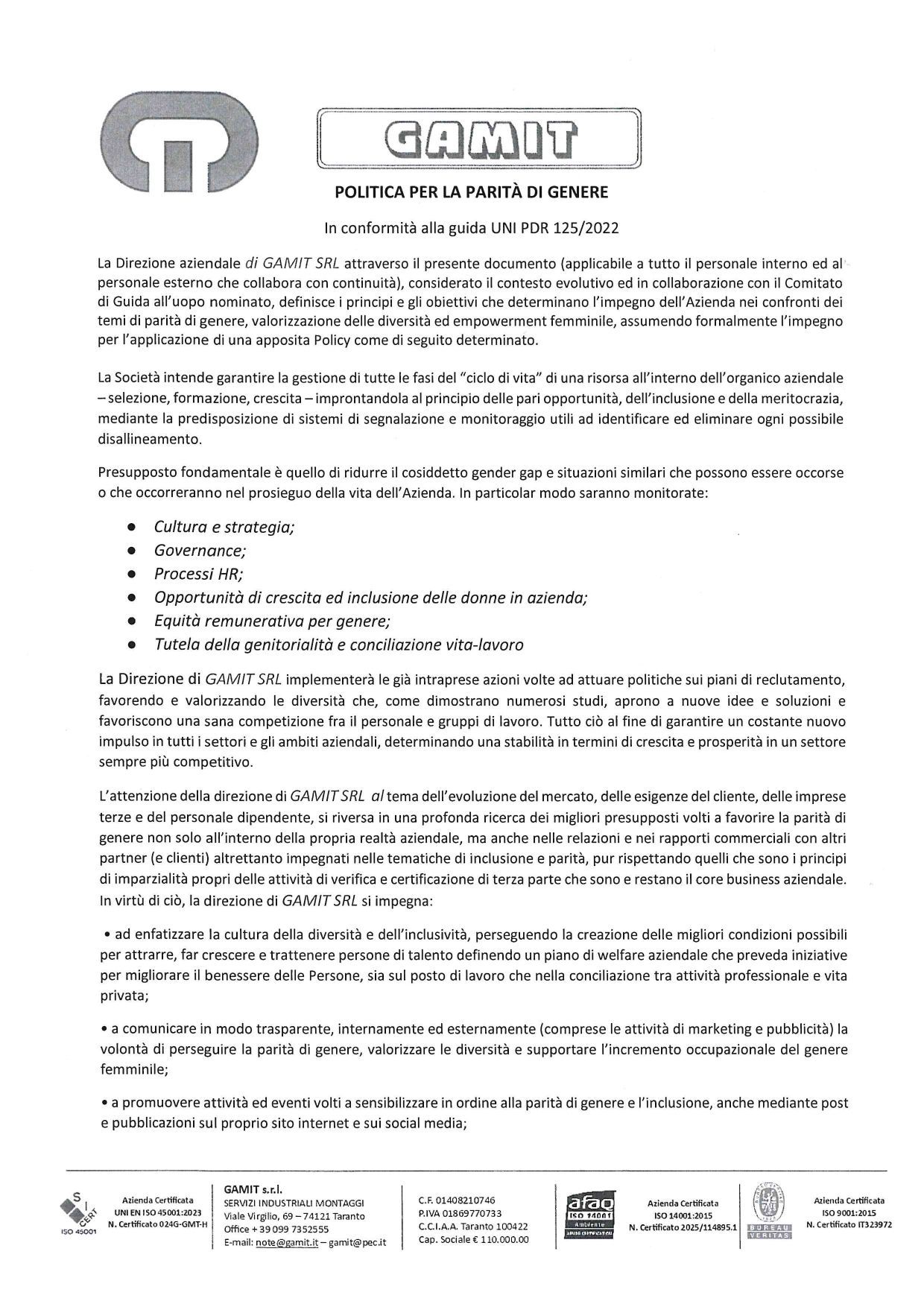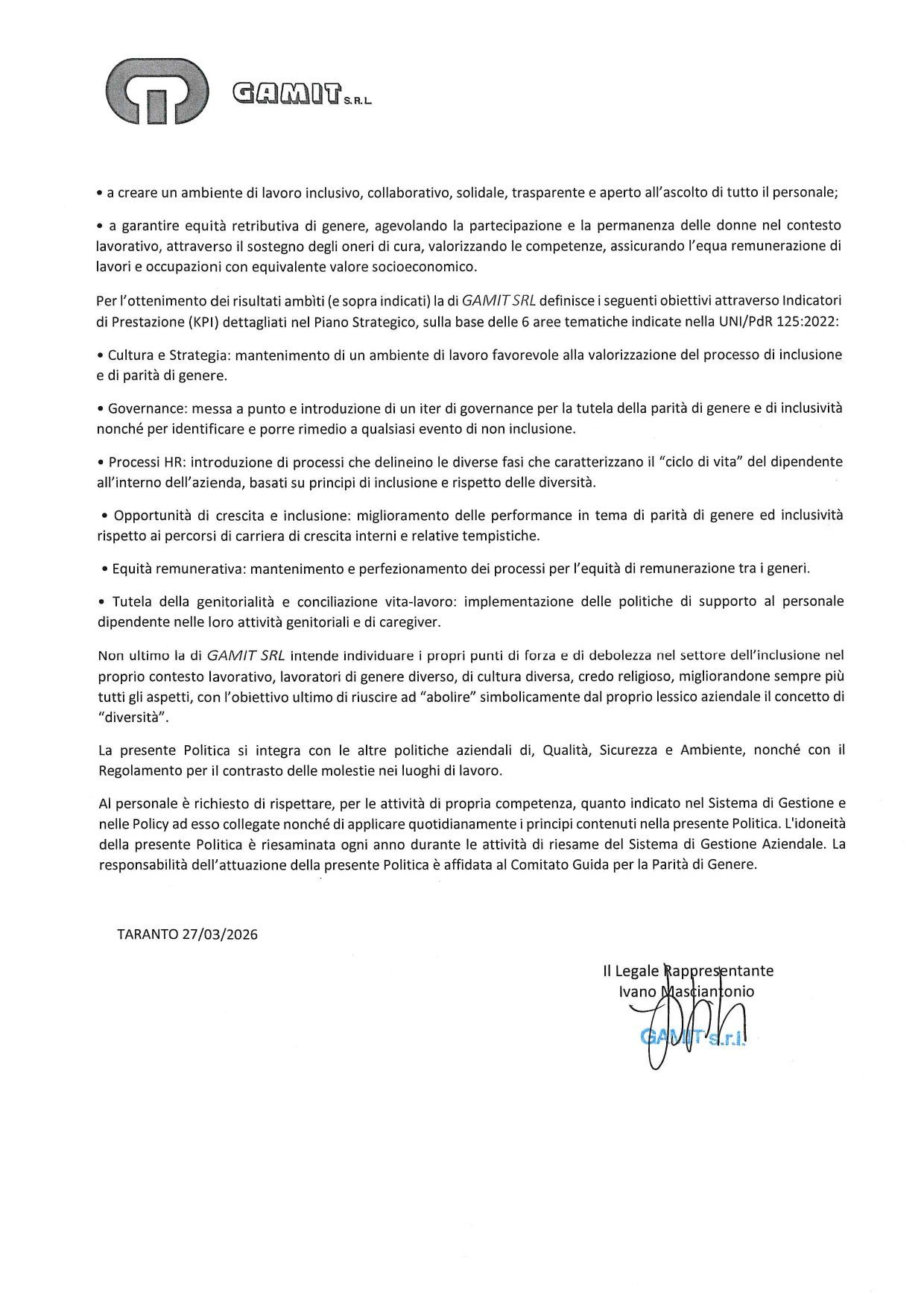 In linea con l'impegno assunto ai sensi della guida UNI PDR 125/2022 e nel rispetto del Regolamento UE 2016/679 (GDPR), GAMIT SRL integra i propri principi d'azione come segue: